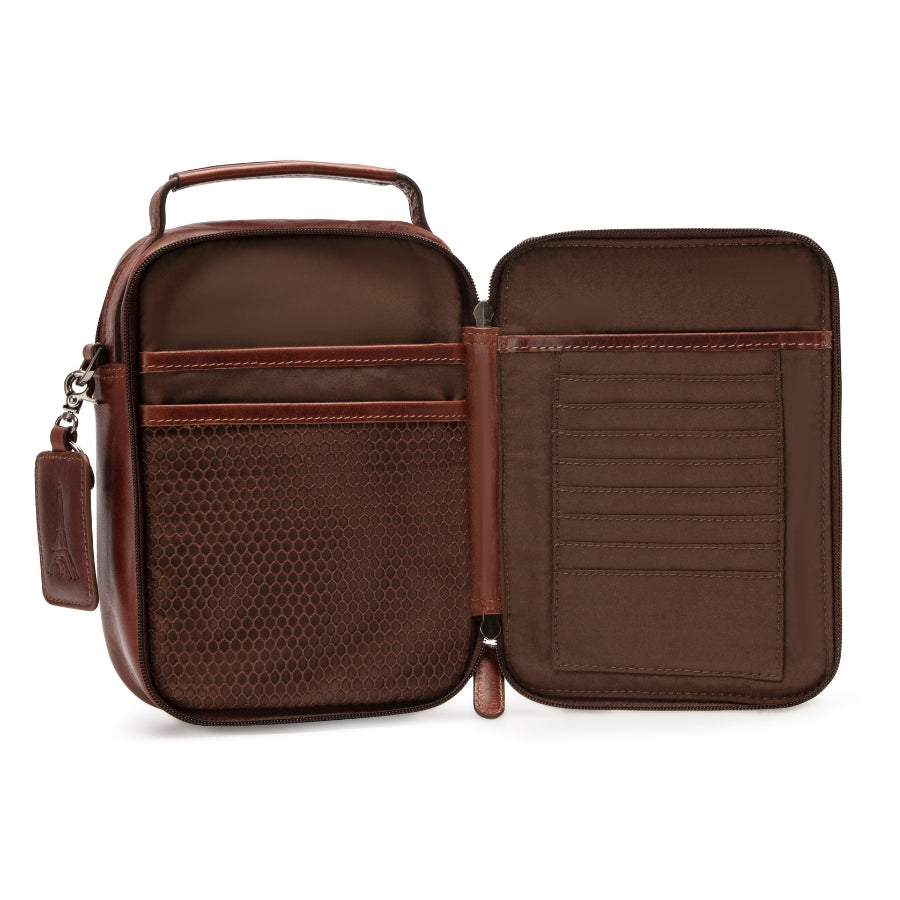 - Two zipped compartments, adjustable canvas strap, and interior slip pocket.