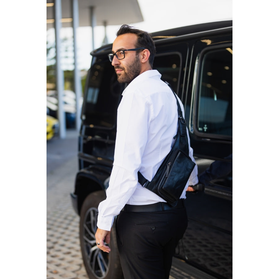 - 1 front & secret zip pocket, 1 back & main zip compartment, key chain holder, adjustable strap.